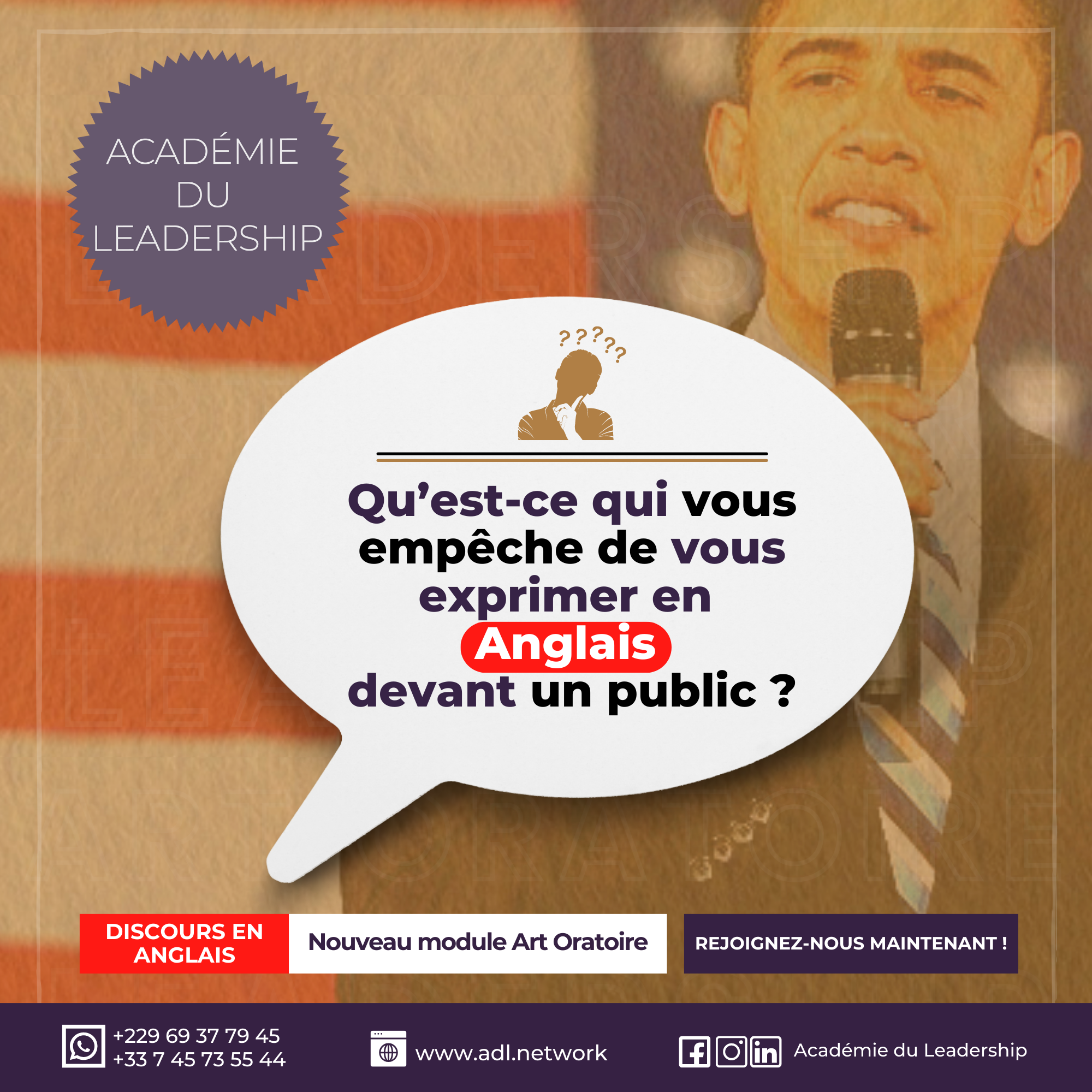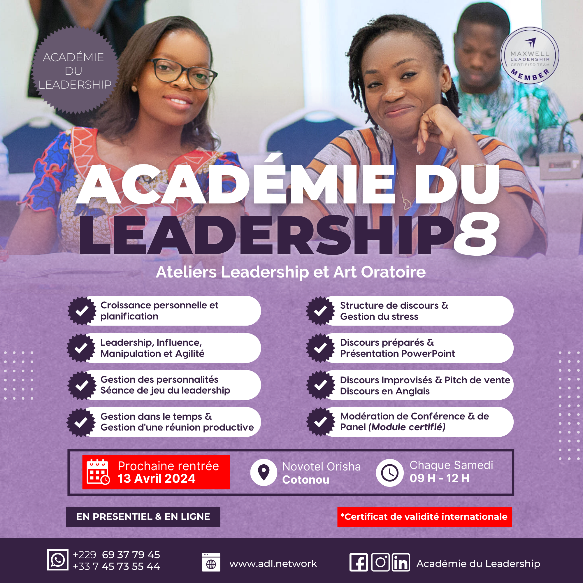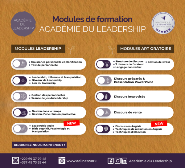 L’Académie du Leadership est un programme de formation de 8 semaines, chaque samedi de 9h à 12h (13 avril-01 juin 2024), au Leadership et à l’art Oratoire pour dirigeant avec des modules sur le Développement du leadership, la planification et l’Art d’une présentation réussie. Nous aidons les hommes et les femmes, qui ont un problème de confiance en soi, de planification, de leadership ou d’Art oratoire, à connaître les techniques efficaces vieilles de plus de 30 ans, pour devenir le leader préféré de leur famille, leurs amis et leurs collègues de travail.