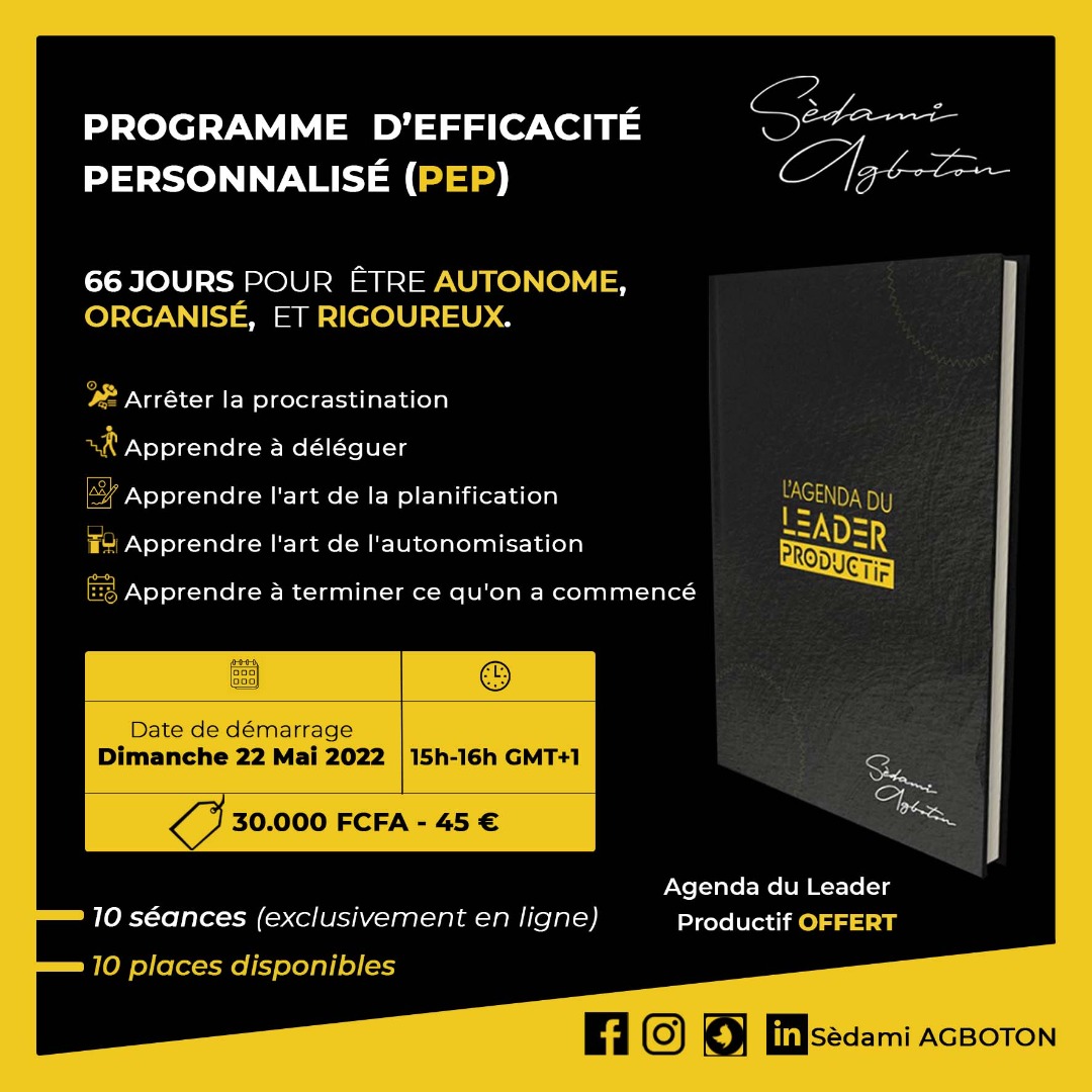 Un Programme d’Efficacité Personnalisé pour mieux s’organiser et ne plus se sentir débordé. Grâce au PEP et à l’Agenda du Leader Productif associé, vous identifierez les carences de votre organisation et reprendrez le contrôle de votre emploi du temps.